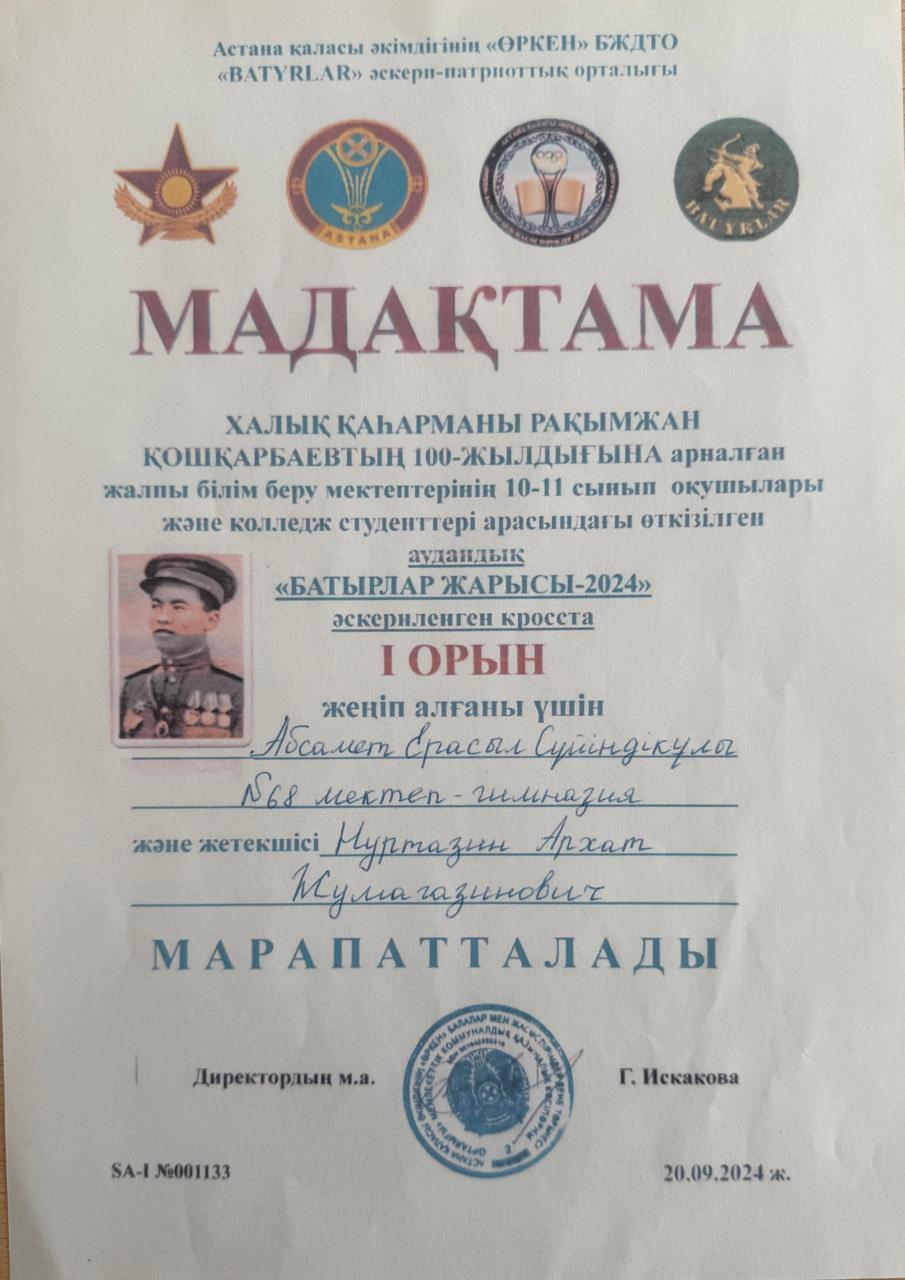 Астана қаласы әкімдігінің "ӨРКЕН" БЖДТО "BATYRLAR" әскери - патриоттық орталығының ұйымдастыруымен халық қаһарманы РАҚЫМЖАН ҚОШҚАРБАЕВТЫҢ 100 ЖЫЛДЫҒЫНА арналған жалпы білім беру мектептерінің 10-11 сынып оқушылары және колледж студенттері арасындағы өткізілген аудандық "БАТЫРЛАР ЖАРЫСЫ-2024" әскериленген корсста І ОРЫН жеңімпаз алғаны үшін мектебіміздің 10 сынып оқушысы АБСАМЕТ ЕРАСЫЛ СҮЙІНДІКҰЛЫ және жектешсісі НҰРТАЗИН АРХАТ ЖУМАГАЗИНОВИЧ марапатталды.