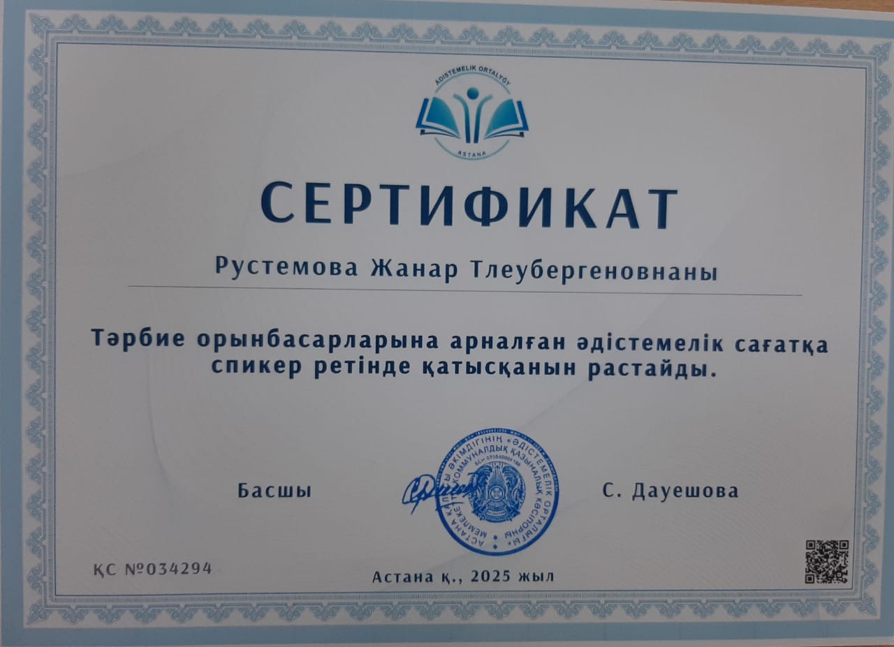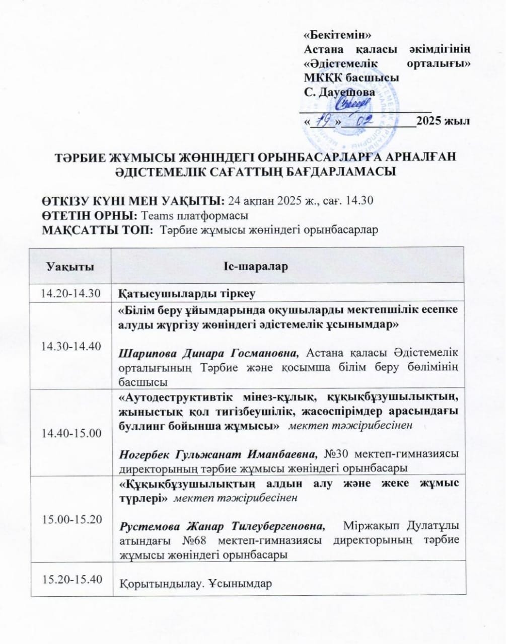 2025 жылғы 24 ақпан күні Астана қаласы әкімдігінің «Әдістемелік орталығы» МКҚК жұмыс жоспарына сәйкес әдістемелік көмек көрсету мақсатында мектеп директорларының тәрбие жұмысы жөніндегі орынбасарларына арналған вебинар өтті. Вебинарға жетпістен аса директордың тәрбие жұмысы жөніндегі орынбасарлары қатысты.