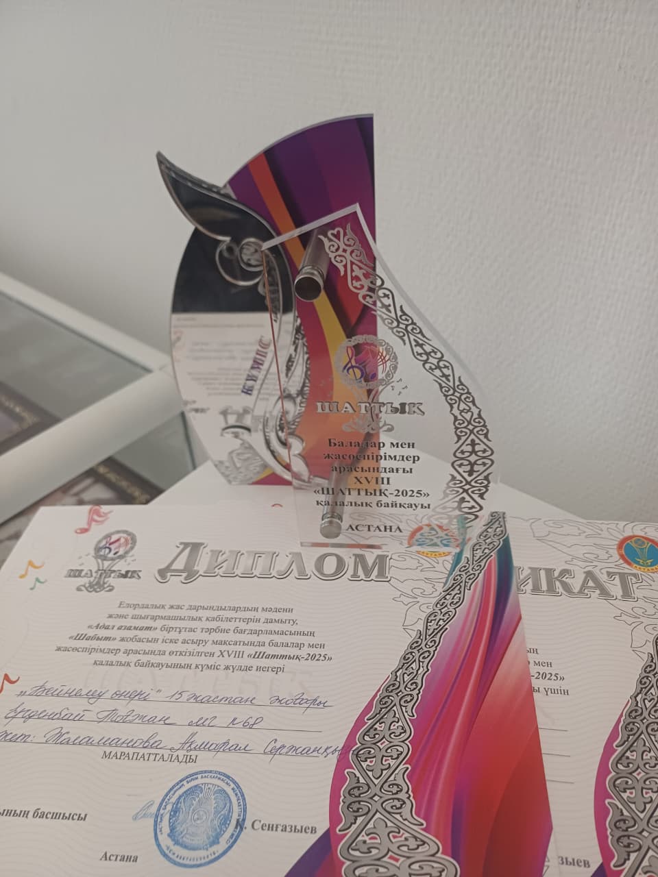 Елордалық жас дарындылардың мәдени және шығармашылық қабілеттерін дамыту "Адал азамат" біртұтас тәрбие бағдарламасының "Шабыт" жобасын іске асыру мақсатында балалармен жасөспірімдер арасында өткізілген XVIII "Шаттық-2025" қалалық байқауының БЕЙНЕЛЕУ ӨНЕРІ номинациясы бойынша 2-орын КҮМІС жүлдегері 9"А" сынып оқушысы Ерденбай Тоғжан Әділбекқызы, жетекшісі Жоламанова Ақмарал Сержанқызы марапатталды. Жеңімпаздарымызды марапаттарымен құттықтаймыз!