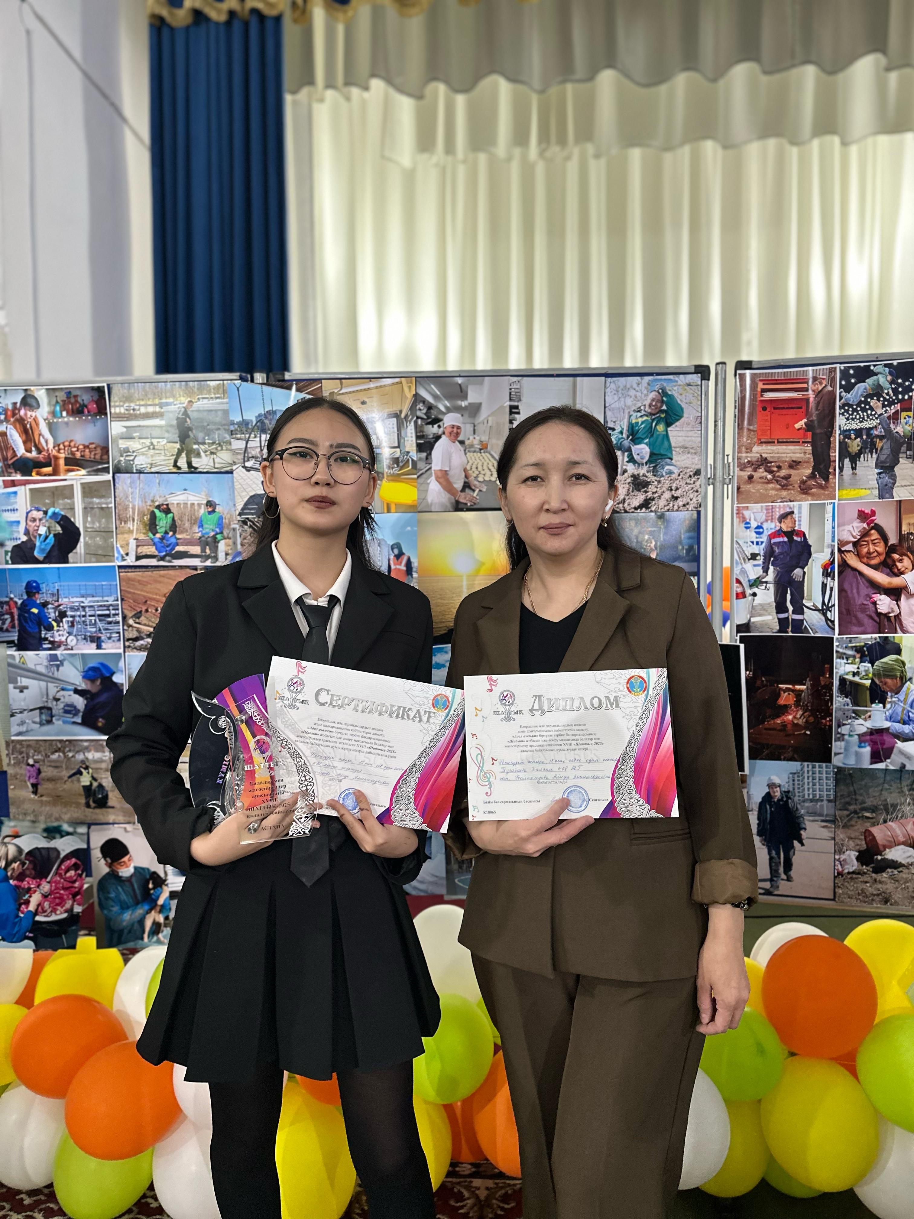 Елордалық жас дарындылардың мәдени және шығармашылық қабілеттерін дамыту, "Адал азамат" біртұтас тәрбие бағдарламасының "Шабыт" жобасын іске асыру мақсатында балалар мен жасөспірімдер арасында өткізілген XVIII "Шаттық-2025" қалалық байқауының күміс жүлде (2-орын) иегері 9"Б" сынып оқушысы Тугибаева Балғын, жетекшісі: Тайтолеуова Айнур Амангелдыевна марапатталды. Жеңімпаздарымызды марапаттарымен құттықтаймыз!